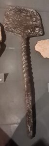 Iron spade. Similar ones have in Estonia been found for example in Otepää hill-fort and Lehmja settlement site, where they can be dated to a long period. Such spades have been interpreted as charcoal spades connected with smithery, or tools associated with cooking (Pets 2003, 170). At the exhibition of Saaremaa Museum.