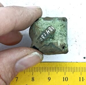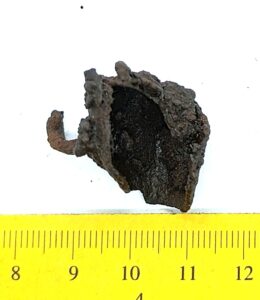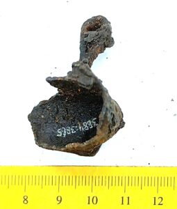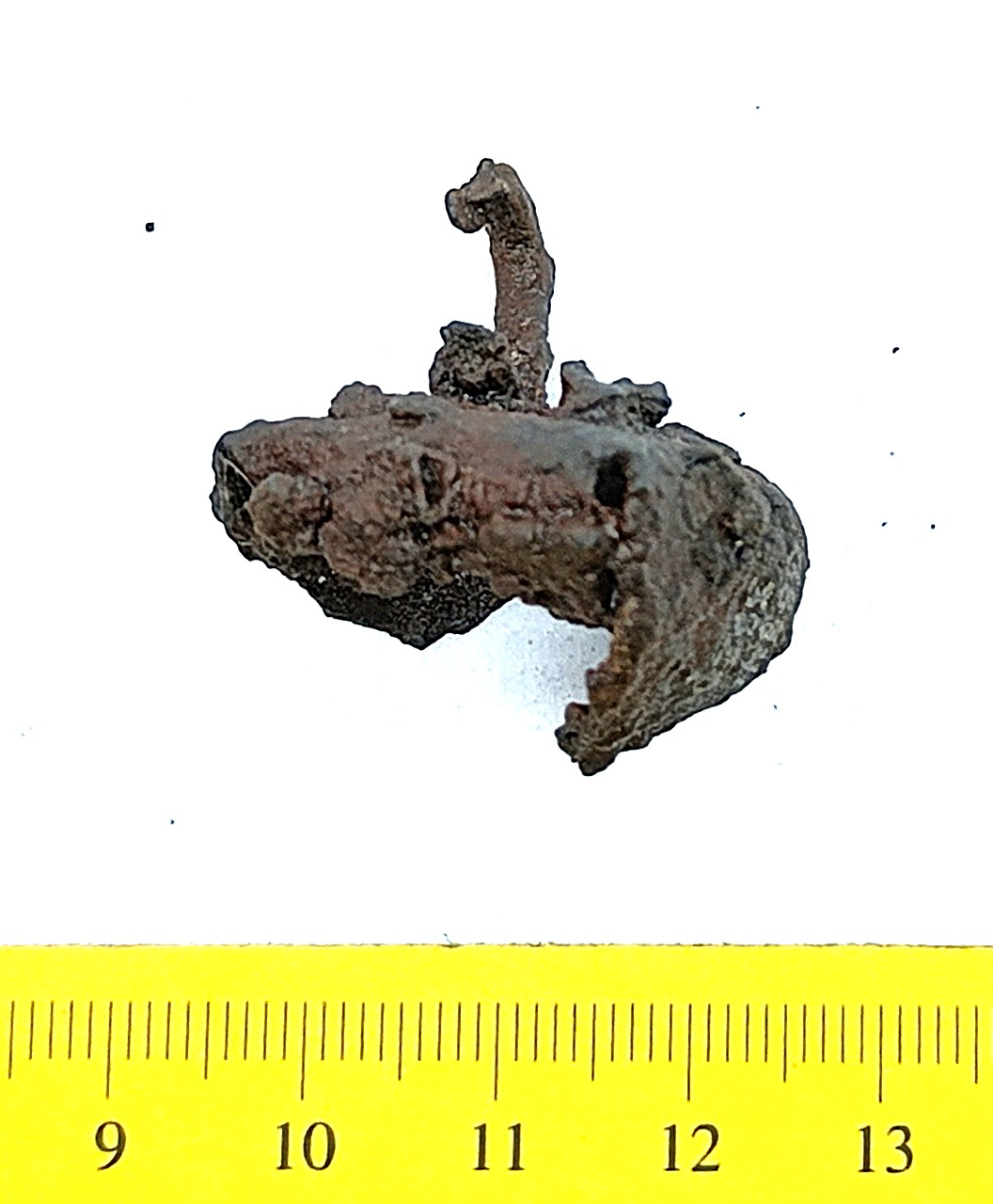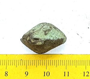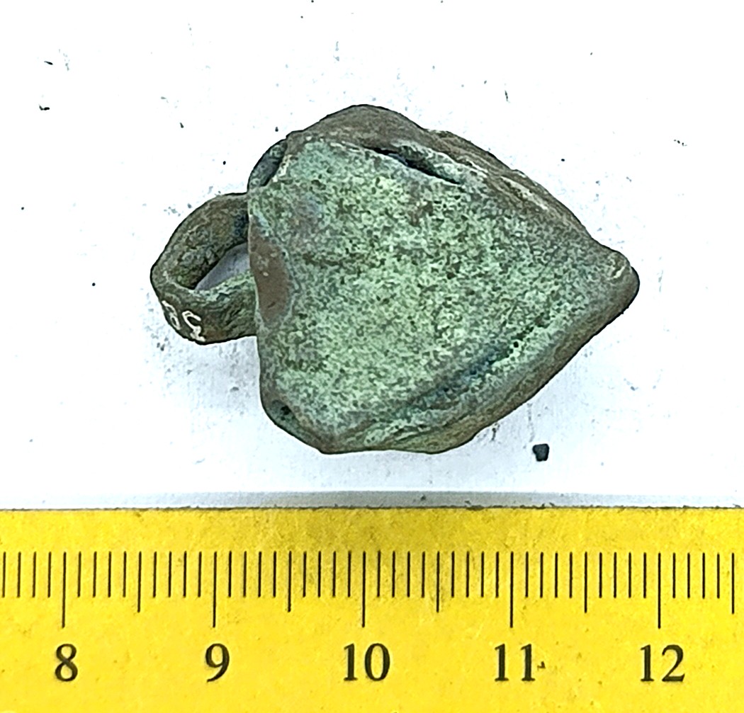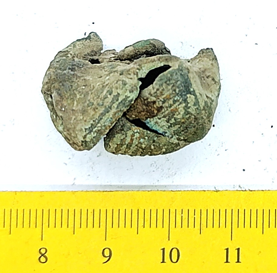 Pear-shaped bell with four grooved leaves, copper alloy. Similar bells have often been found in stone graves with cremations, but also, for example, from Siksäla graveyard (Mägi 2002, Pl. 33: 7; Valk et al. 2012, 24, 45-46, 31). The bell belongs to Rainio group 3a or 3b (Rainio 2010, 28).