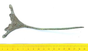Dress pin, copper alloy Ornament of parallel lines, the upper edge decorated with two animal figures facing opposite directions. Most of similar pins have been found in stone graves with cremations in Saaremaa, sometimes also in West-Estonia (Mägi 2002, 104). Pins with precisely the same shape do not occur in inhumations dated after the very beginning of the 13th century.