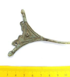 Dress pin, copper alloy. Triangular-headed. The majority of such pins have been found in stone graves with cremations in Saaremaa, sometimes also in West-Estonia (Mägi 2002, 104). They do not occur in inhumation graves after the very beginning of the 13th century. Some such pins are also known from the Livic area in Latvia, where they probably mark graves of Saaremaa women (e.g. Zariņa 2006, Pl. 209: 2).