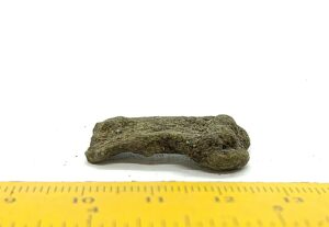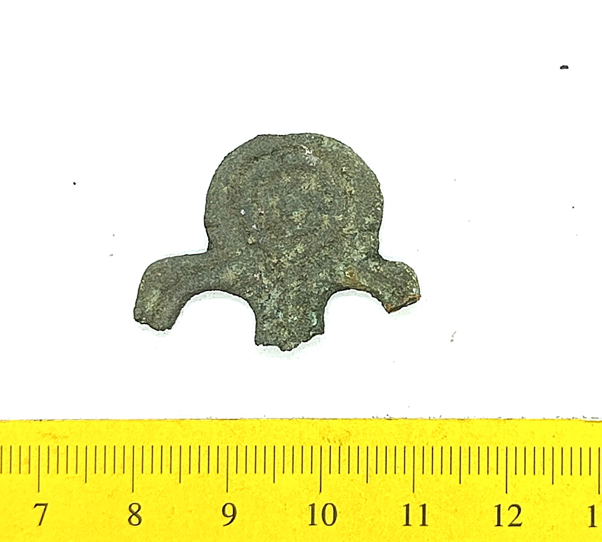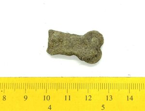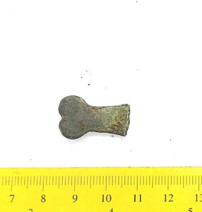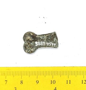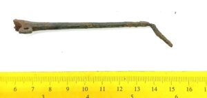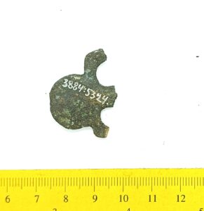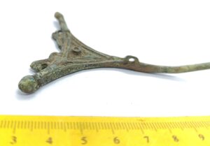 Double cross-headed pin with connected terminals, copper alloy. Such pins are mainly found in inhumations from the 13th-century but were possibly taken into use as early as in the end of the 12th century (see also Mägi et al. 2018, 94, Fig. 14: 1).