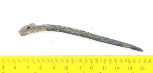 Dress pin, copper alloy. The majority of such pins have been found in stone graves with cremations in Saaremaa, sometimes also in West-Estonia (Mägi 2002, 104). They do not occur in inhumation graves after the very beginning of the 13th century. Some such pins are also known from the Livic area in Latvia, where they probably mark graves of Saaremaa women (e.g. Zariņa 2006, Pl. 209: 2).