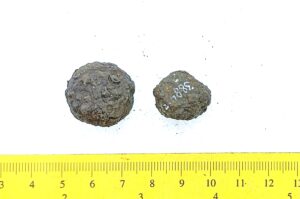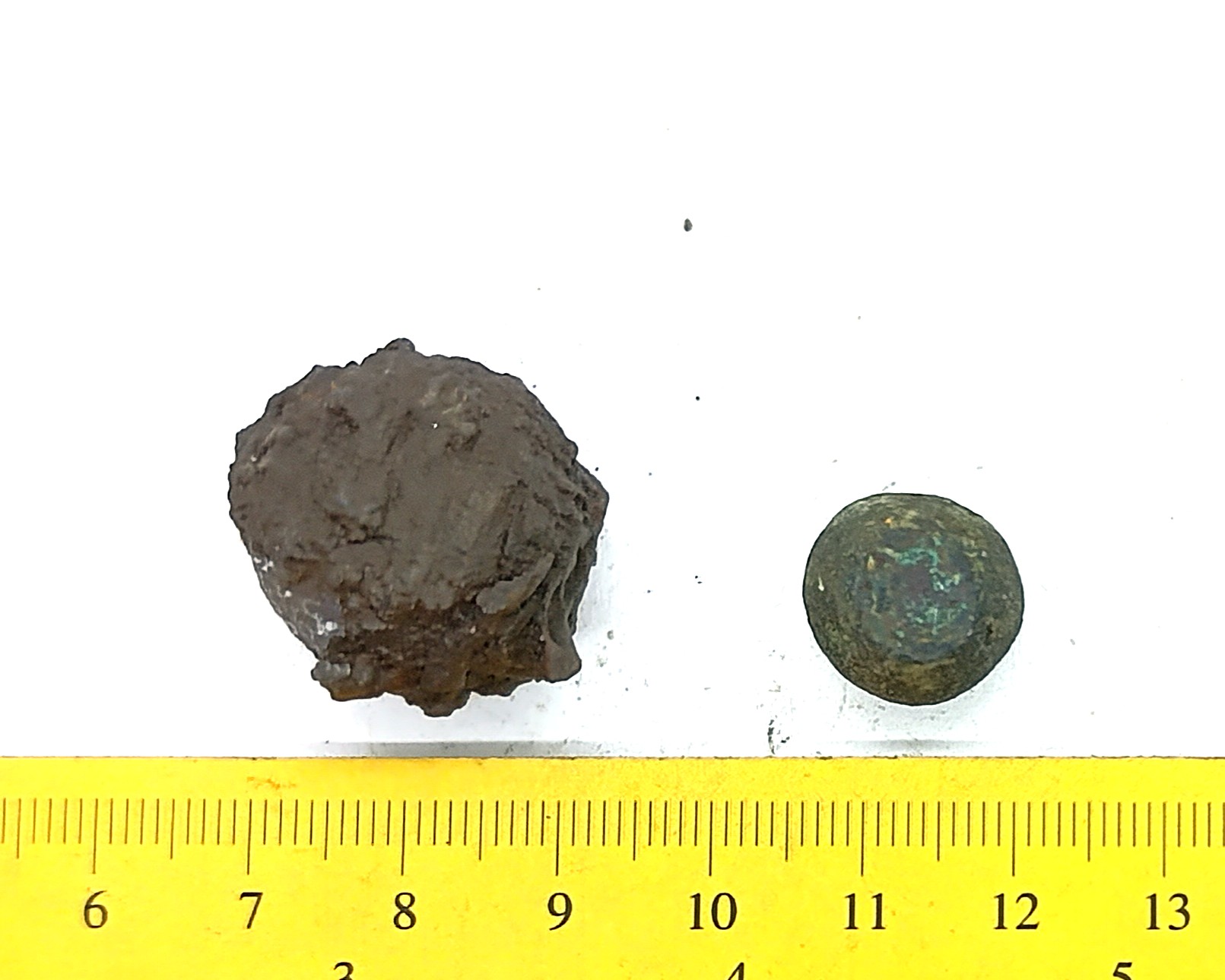 Spheric weights, copper alloy and iron, 2.