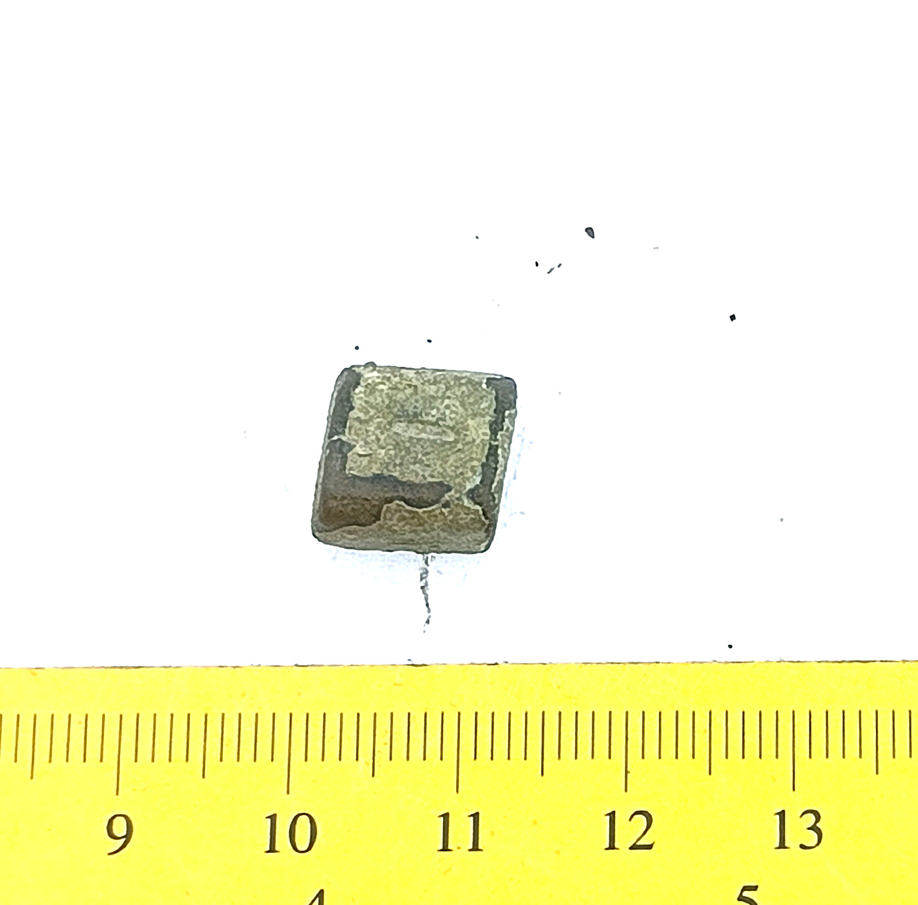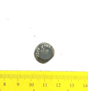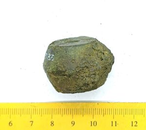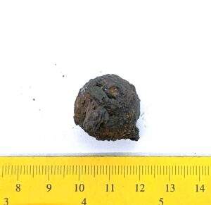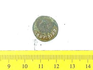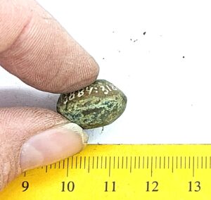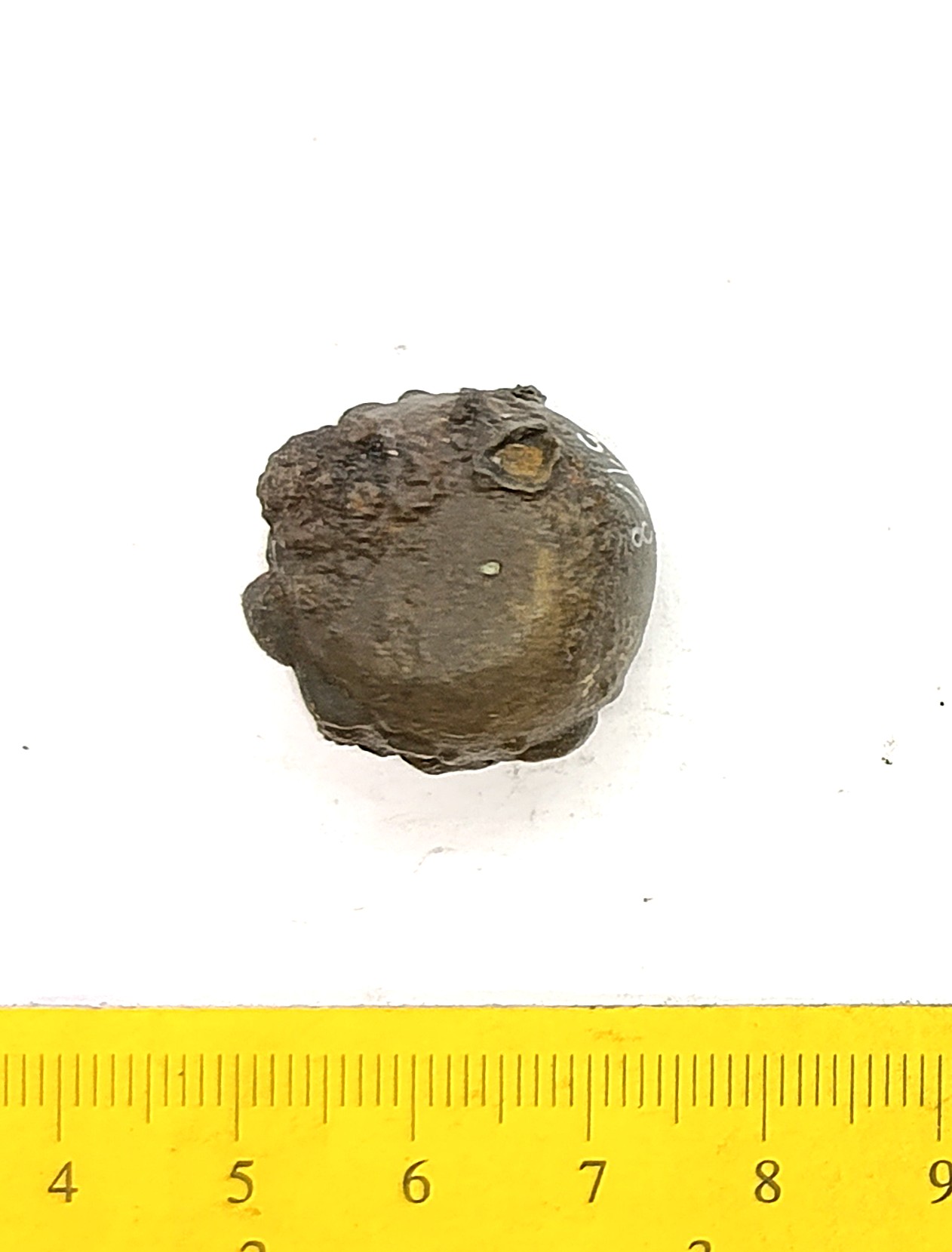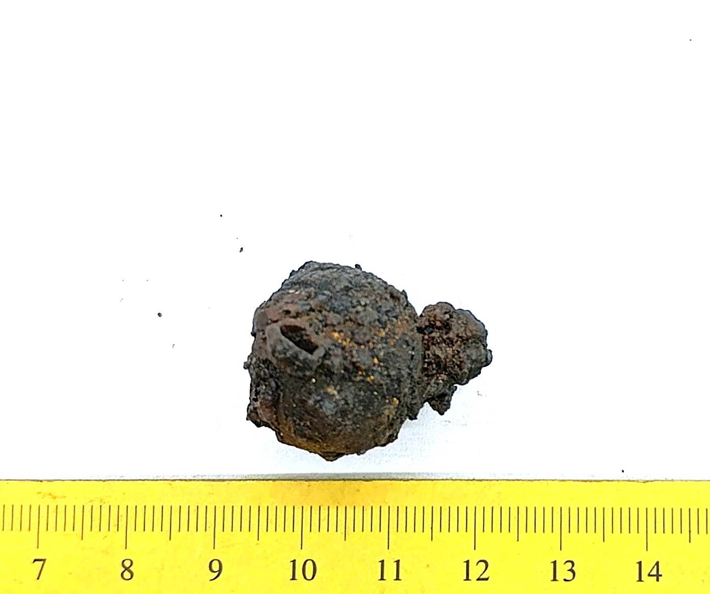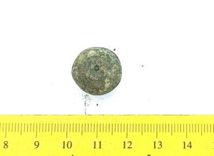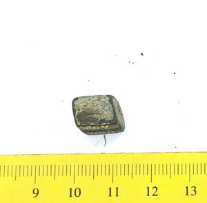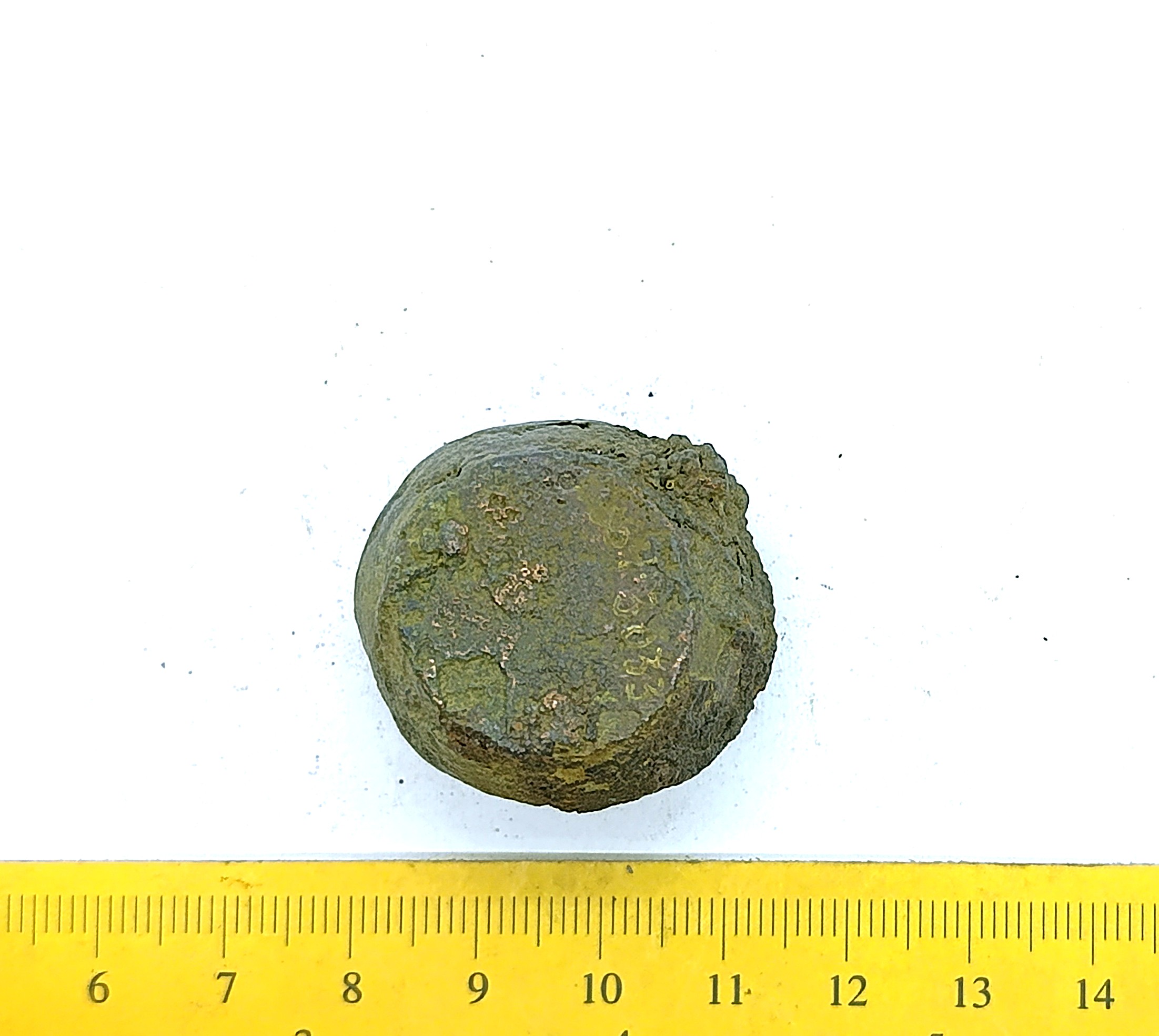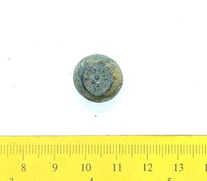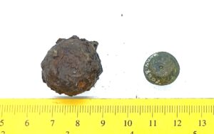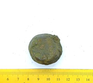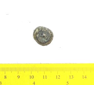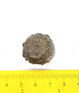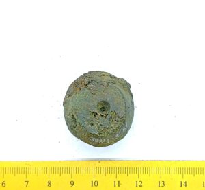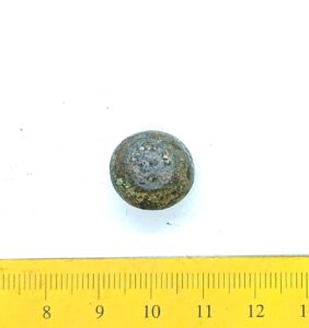 Spherical weight, copper alloy and iron. Circles on the faces. Such weights are dated to the late 11th century and to the 12th century in Latvia (Berga 2017)