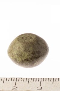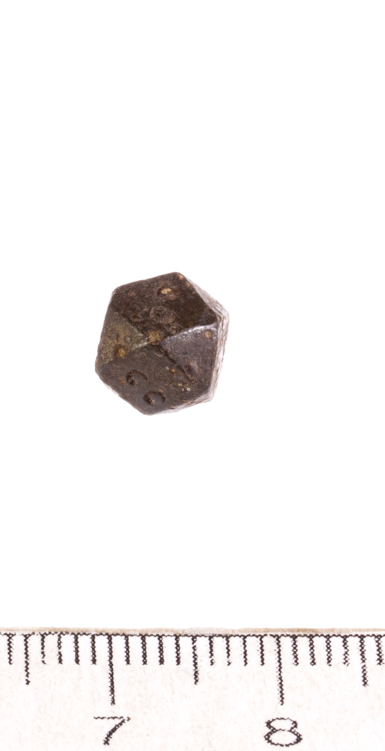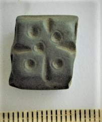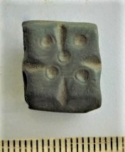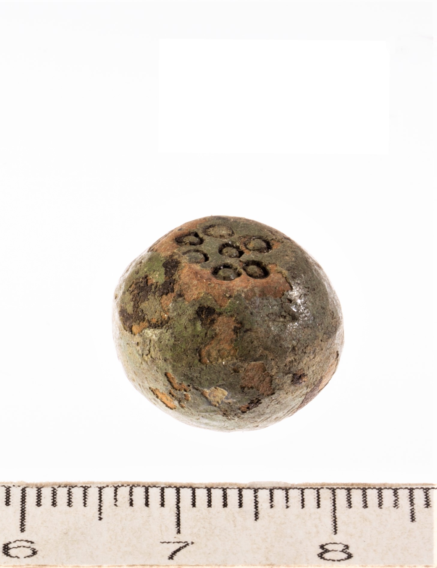 Spherical weight, iron and bronze. Seven circles on the faces. Such weights are dated to the late 11th century and to the 12th century in Latvia (Berga 2017).