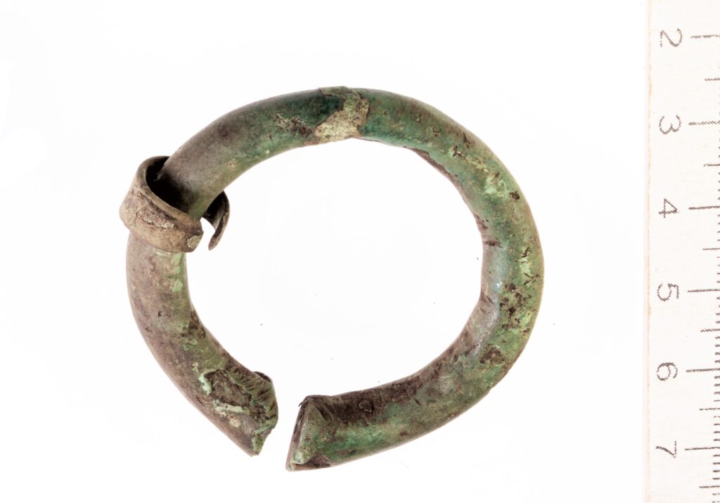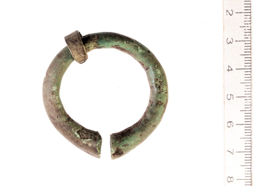 Penannular brooch with thickening terminals, copper alloy. The pin is narrow-based, broken. Possibly imported from Couronia, where such brooches have been found in 11th-13th-century burials (Griciuvienė 2009, 317, 339).