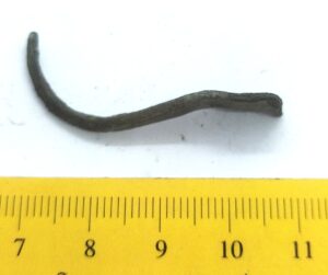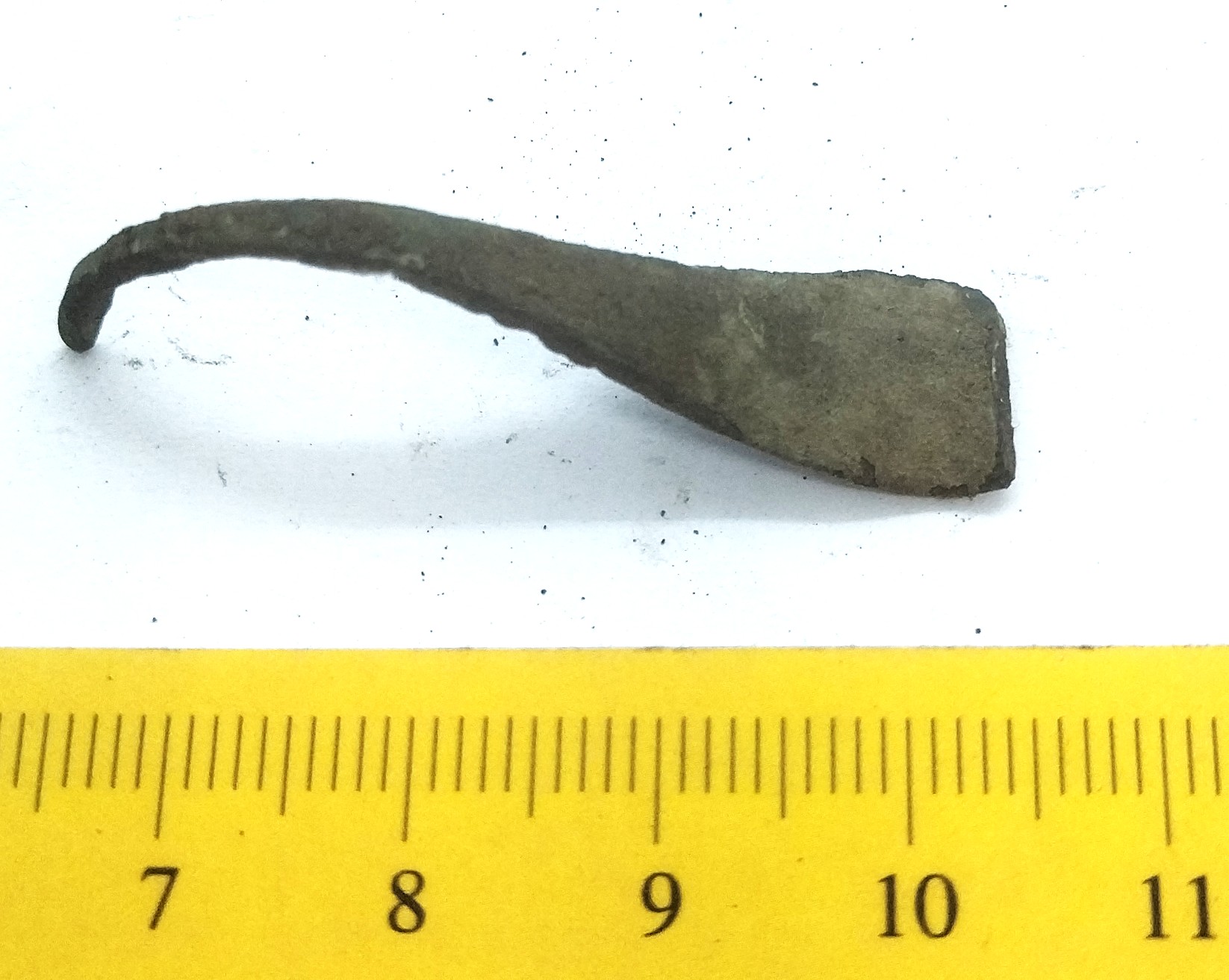 Finger-ring with a widening central part, copper alloy. Similar rings have been found in the Eura Luistari and Saramäki burials in Finland where they are dated to the 11th century (Lehtsalo-Hilander 1982, 124–126) and from Abelnieki burials in Latvia, where they are dated from the second half of the 11th century to the beginning of the 13th century (Vasks 2008, 157–158). These rings also occur in Gotland, where they are dated to the 11th-12th century in Gotland (Thunmark-Nylen 1998, Pl. 143). In Saaremaa, a similar finger-ring is recorded in Valjala churchyard where it, according to the context, belongs to the 13th or perhaps late 12th century.