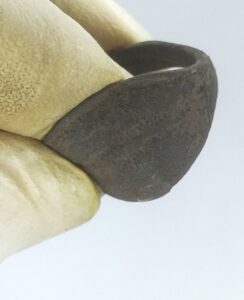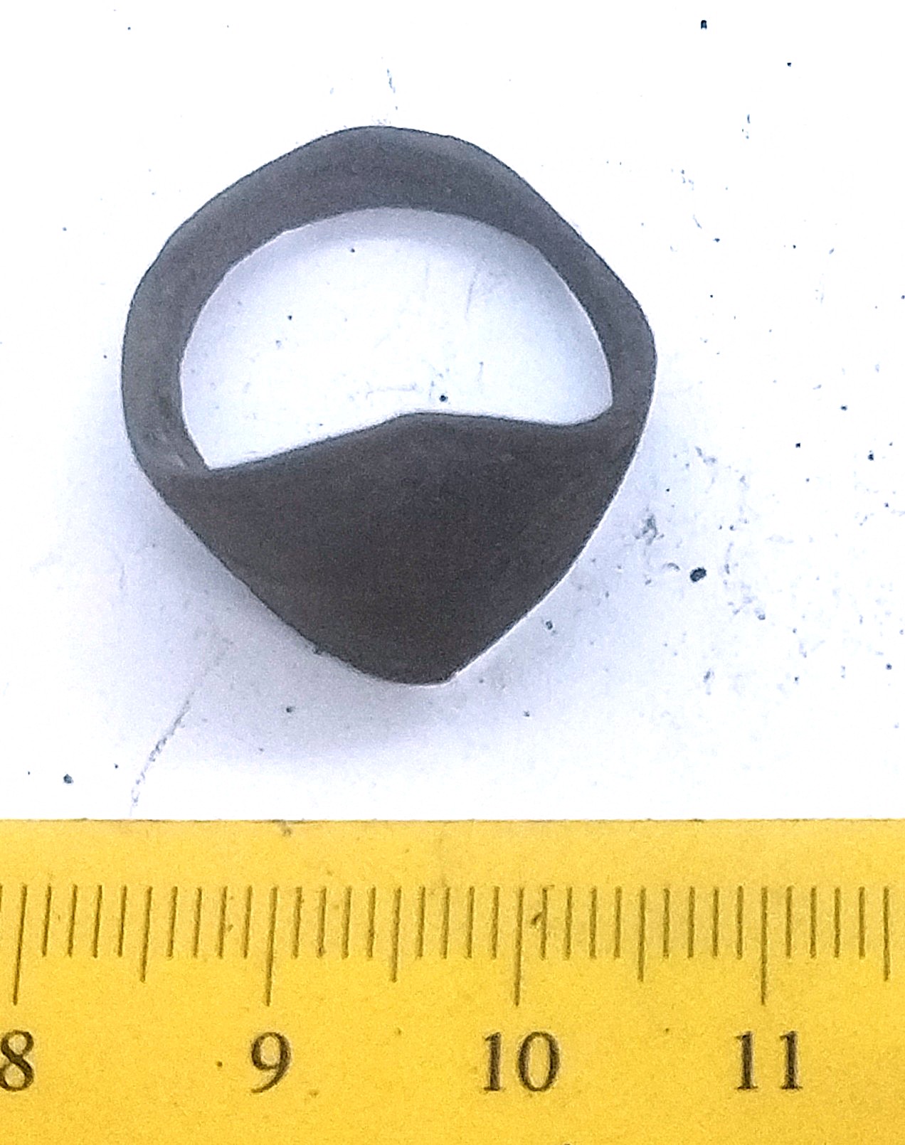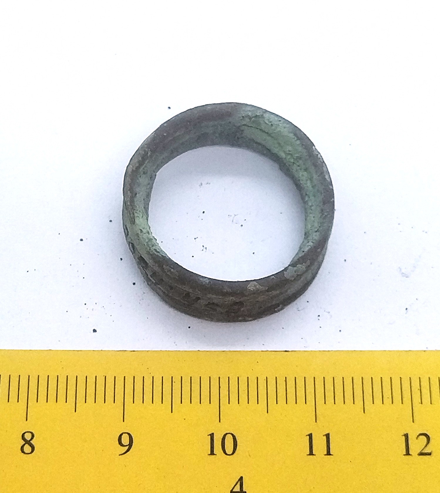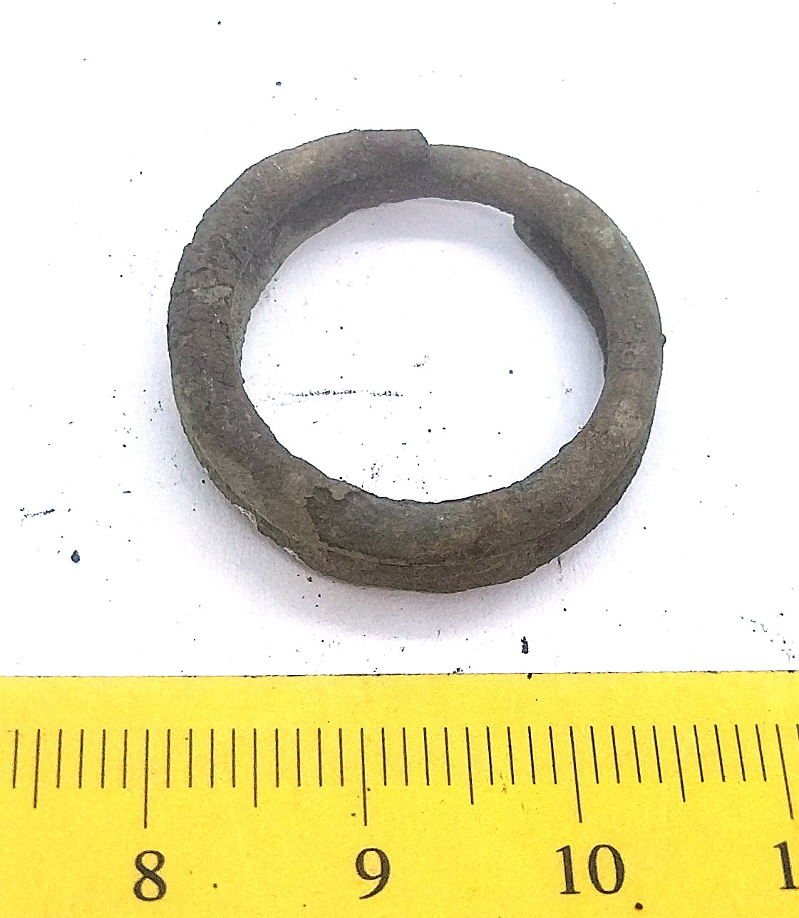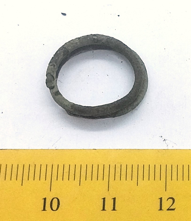 Finger-ring, copper alloy. This type of finger-ring has a thickened middle section. A well-known type of ring in the archaeological material of the Estonian islands often found in both stone graves with cremations as well as inhumation burials. Could have come into use already in the 12th century AD (Mägi 2002, 109).