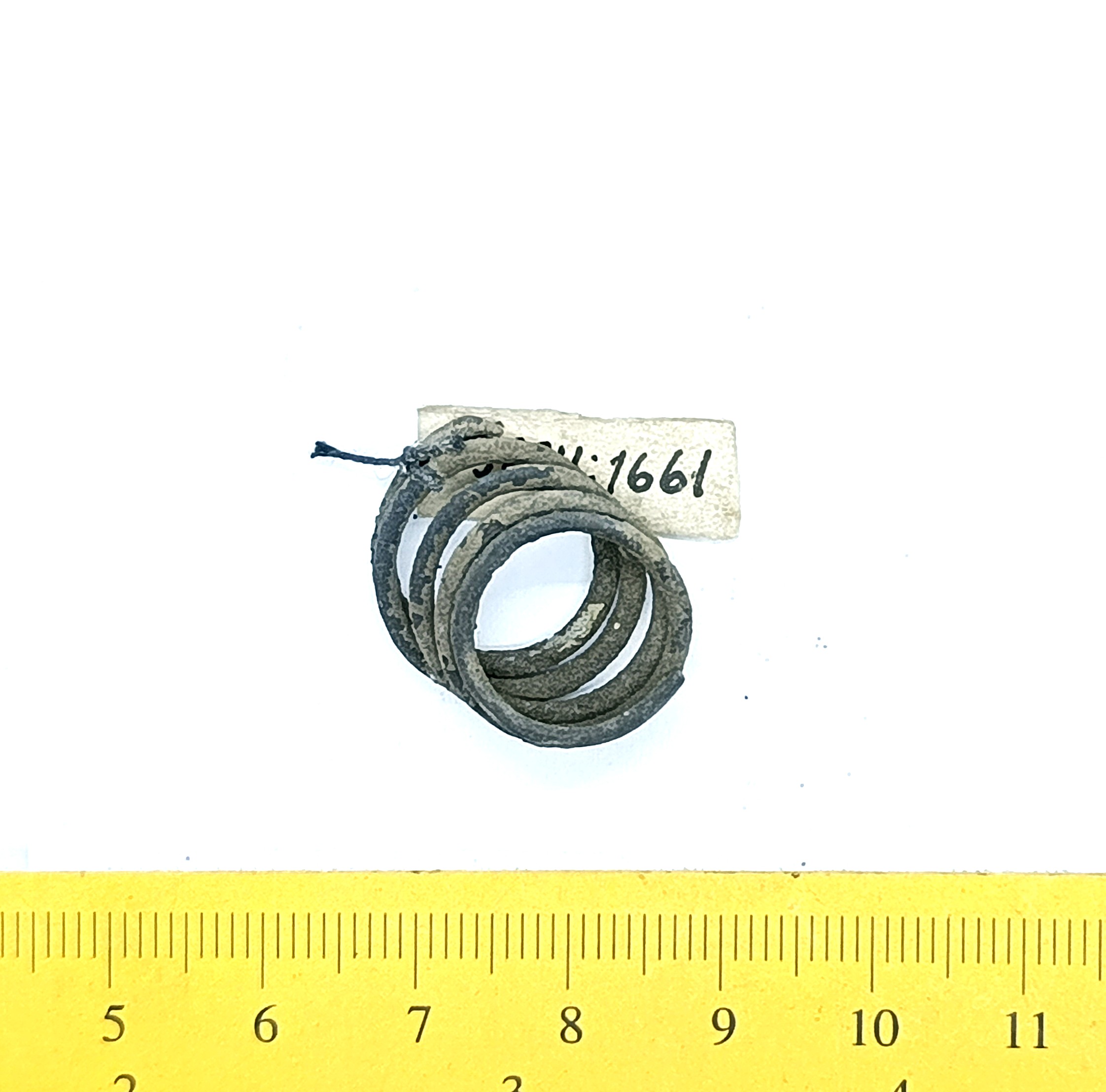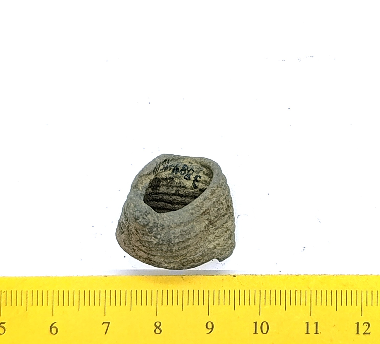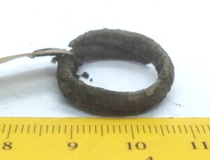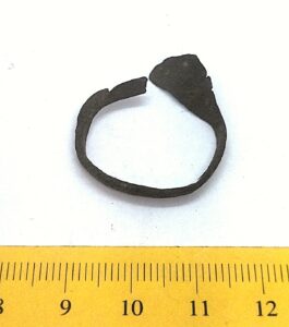 Finger-ring with a widening central part, copper alloy. Similar rings have been found in the Eura Luistari and Saramäki burials in Finland where they are dated to the 11th century (Lehtsalo-Hilander 1982, 124–126) and from Abelnieki burials in Latvia, where they are dated from the second half of the 11th century to the beginning of the 13th century (Vasks 2008, 157–158). These rings also occur in Gotland, where they are dated to the 11th-12th century in Gotland (Thunmark-Nylen 1998, Pl. 143). In Saaremaa, a similar finger-ring is recorded in Valjala churchyard where it, according to the context, belongs to the 13th or perhaps late 12th century.