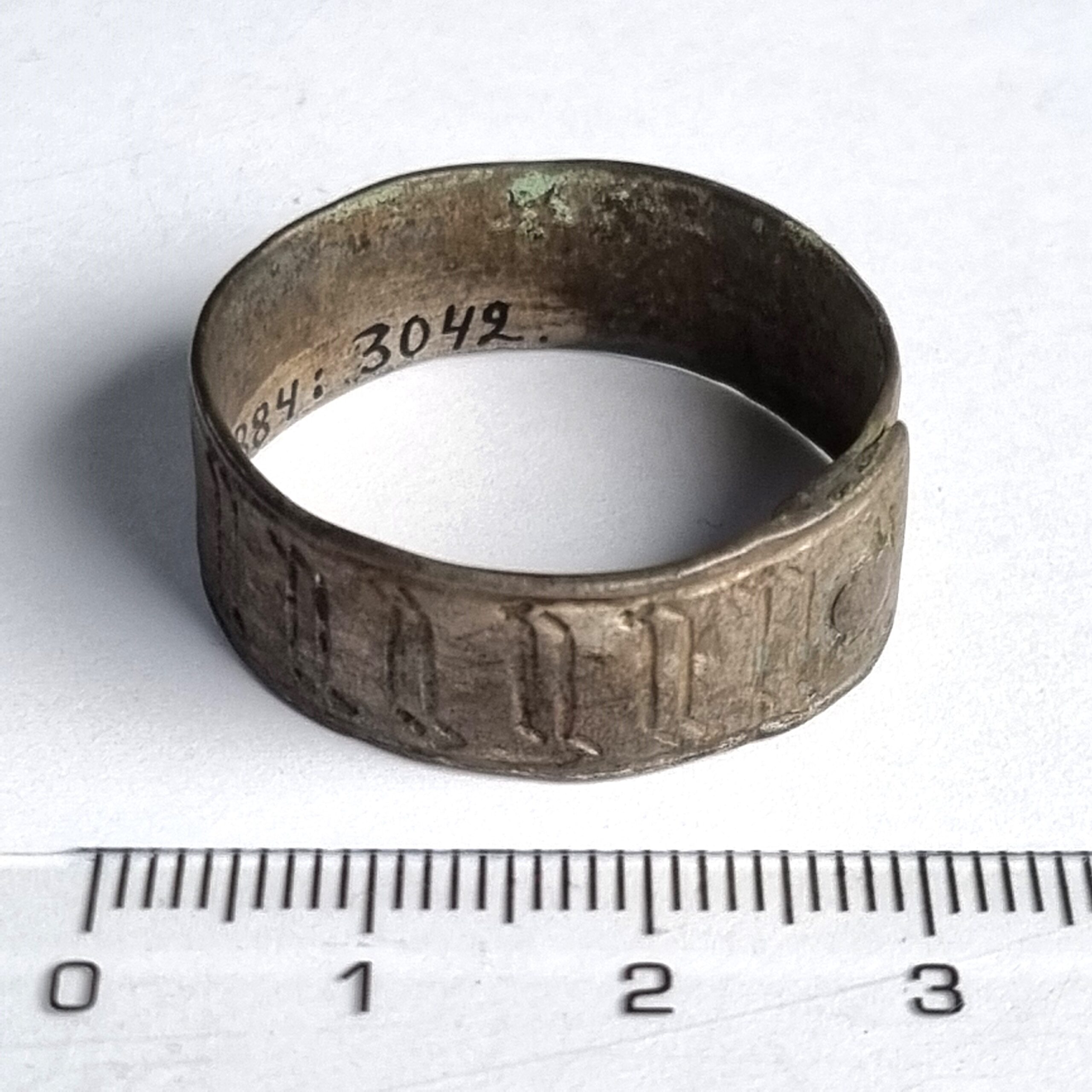 Finger-ring with a widening central part, copper alloy.