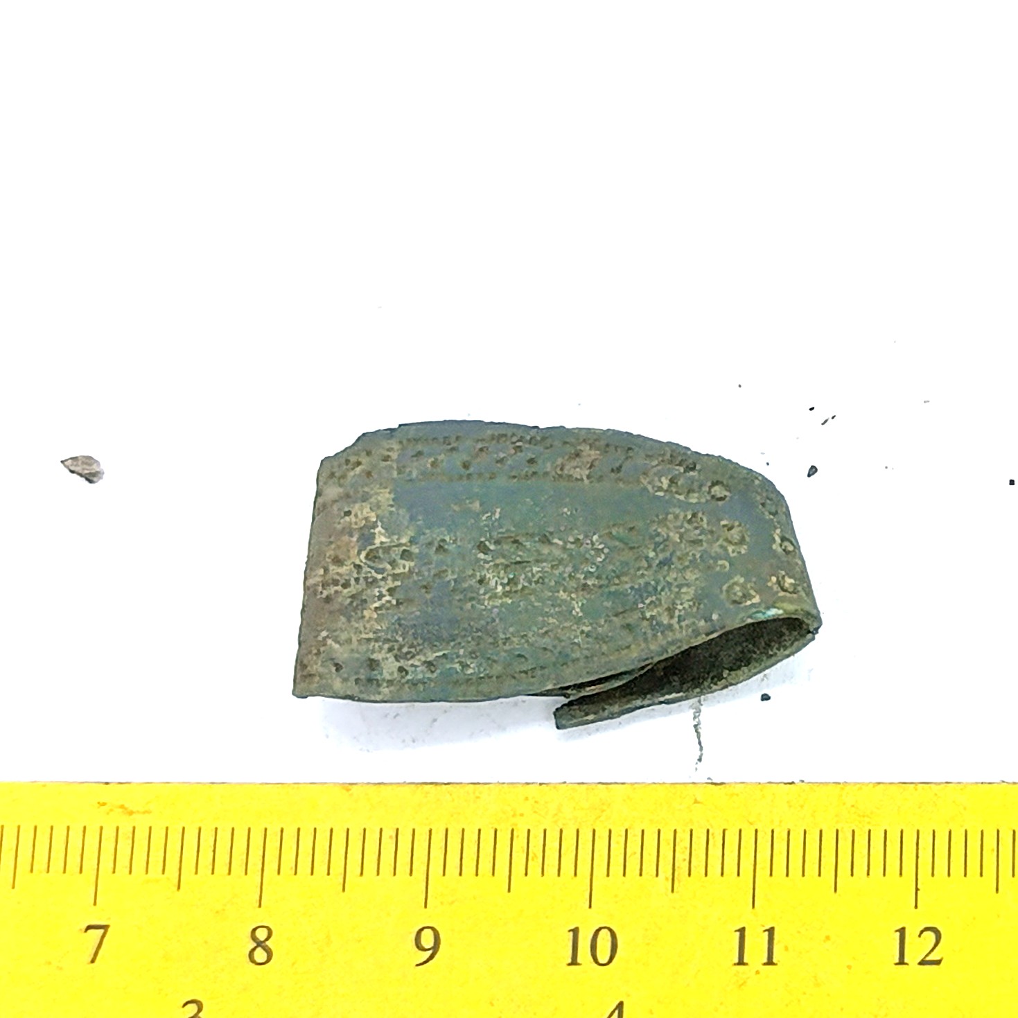 Finger-ring with a widening central part, copper alloy. Similar rings have been found in the Eura Luistari and Saramäki burials in Finland where they are dated to the 11th century (Lehtsalo-Hilander 1982, 124–126) and from Abelnieki burials in Latvia, where they are dated from the second half of the 11th century to the beginning of the 13th century (Vasks 2008, 157–158). These rings also occur in Gotland, where they are dated to the 11th-12th century in Gotland (Thunmark-Nylen 1998, Pl. 143). In Saaremaa, a similar finger-ring is recorded in Valjala churchyard where it, according to the context, belongs to the 13th or perhaps late 12th century.