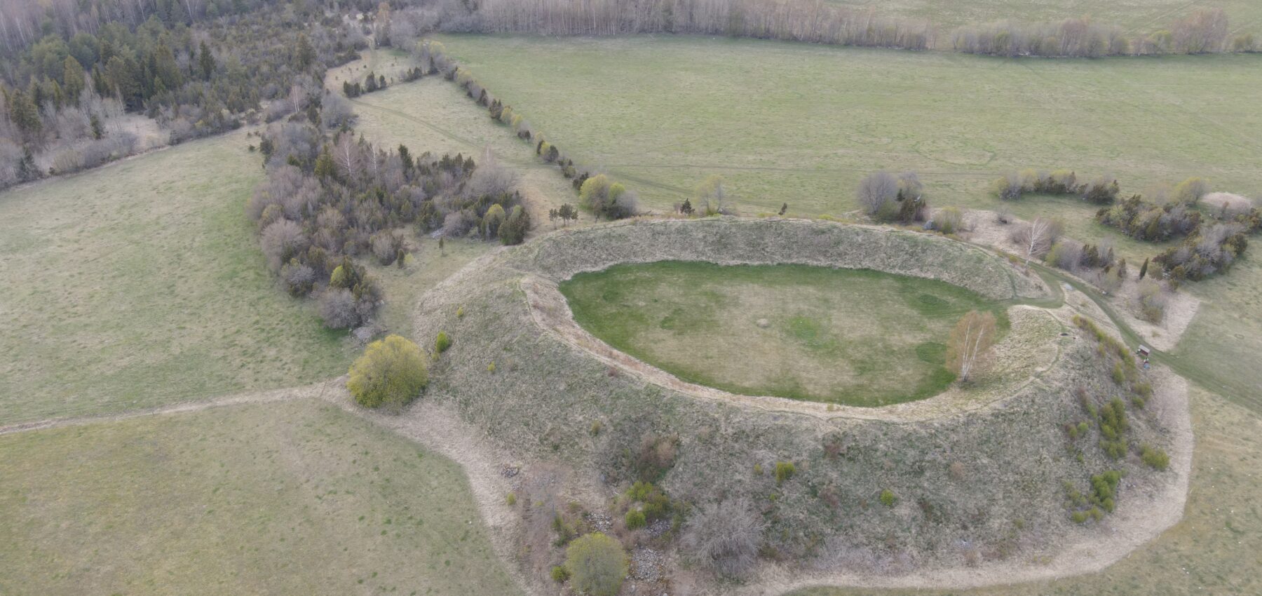 Pöide hill fort was one of the biggest prehistoric and medieval fortifications in Saaremaa. The present height of the walls is 5-6 m from the courtyard, and 10-11 m from the outside. Up to the 18th century, stone walls of the fortification reached ca 5 m above the present walls, but were all removed for other buildings. Depressions on the top of the hill fort’s rampart date to the World War I, and had military purpose. The hill fort courtyard is 85 m long and 55 m broad, and in the middle of it is a hollow, one-time well. Until about 1900 a second wall surrounding the hill fort was visible, but it was later removed. Today the fort is surrounded by a cleared field.