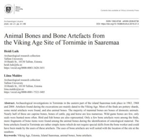 Luik, H.; Maldre, L. (2020). Animal Bones and Bone Artefacts from the Viking Age Site of Tornimäe in Saaremaa. Archaeologia Lituana, 21, 41−58. DOI: 10.15388/ArchLit.2019.21.3.