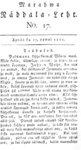 Marahwa Näddala-Leht, Number 17, 27 April 1821. Contains three texts in Estonian about Saaremaa, Muhumaa and Ruhnu island: