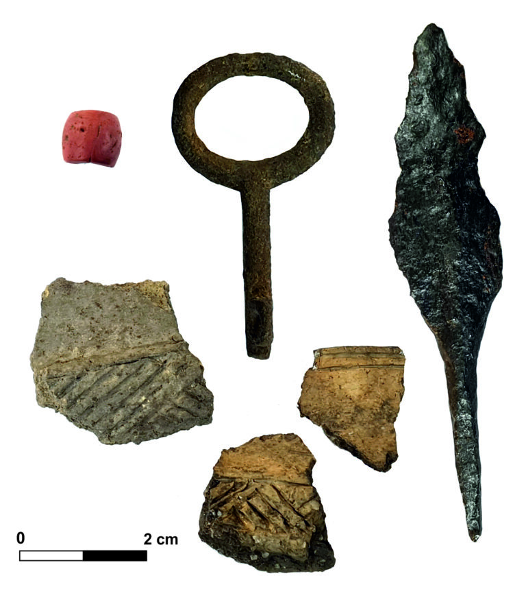 The cultural layer of the Tornimäe site was intense, even though later farming had heavily impacted it. Potsherds were the most abundant finds, but also numerous metal artifacts like jewellery, weapons, and tools came to light. Additionally, boat rivets and possible bead-making items, as well as some tools denoting other handicrafts were found. A great number of bones of domesticated animals and fish were recorded, suggesting that the site also functioned as a fishing harbour. Items demonstrating foreign relations consisted only of some foreign potsherds and ornaments.