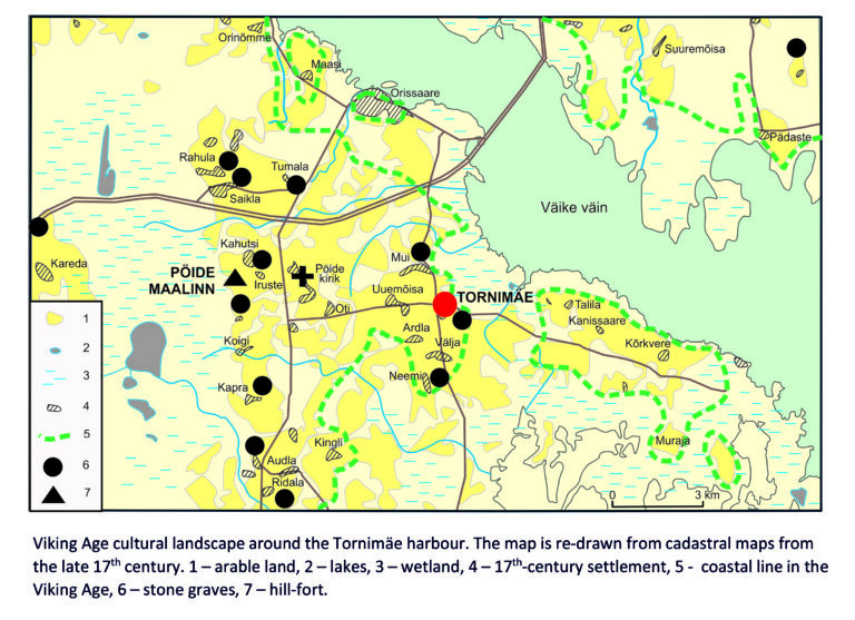The harbour of Tornimäe (meaning Tower Hill; on historical maps also Linnamägi, Town Hill) was located at a strategically well-chosen place which offered a good view of the Suur Strait (between the present-day islands of Saaremaa and Muhu) and the strait between the main island (former Kuresaar) and Kõrkvere (present-day peninsula). It was a suitable landing site for Viking Age vessels and allowed easy control of the traffic along the waterways from Gotland to the Gulf of Finland. Although Tornimäe can be considered connected with the Eastern Way, or Austrvegr, the finds are mostly local or originate from the neighbouring regions, thus not indicating any wide-scale international trade.