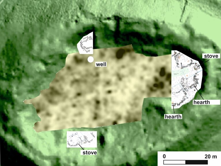 The outer rampart (wall 1; visible on the LiDAR map) was almost circular in shape, with a diameter of 186-193 m. A few dozen metres towards the centre of the fortification system was wall 2, which was probably oval in shape and is still partially visible on LiDAR maps at the foot of the main hill-fort. The walls 1 and 2 were not very strong, with stone walls about 2m wide and 2m high, probably topped by an additional timber facade.