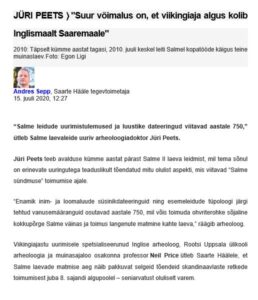 Sepp, A. (2020). Jüri Peets: “Suur võimalus on, et viikingiaja algus kolib Inglismaalt Saaremaale.” Saarte Hääl, 15.07.2020.