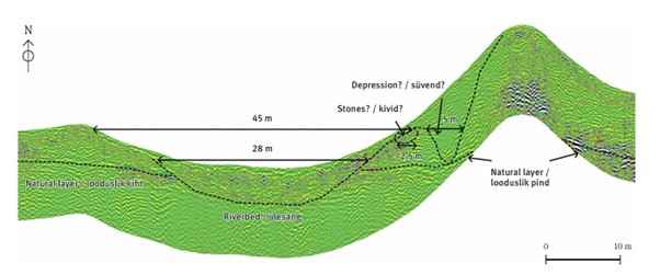 Georadariga tehtud läbilõige Kaarma maalinna lääneküljest. Joonis: Hannes Tõnisson, Olav Harjo.