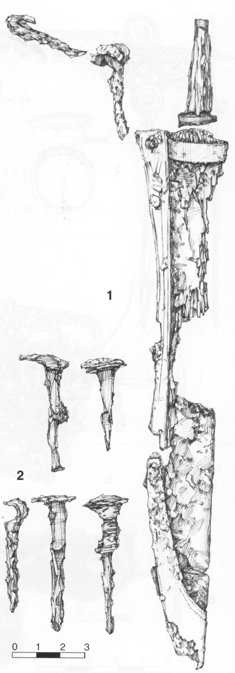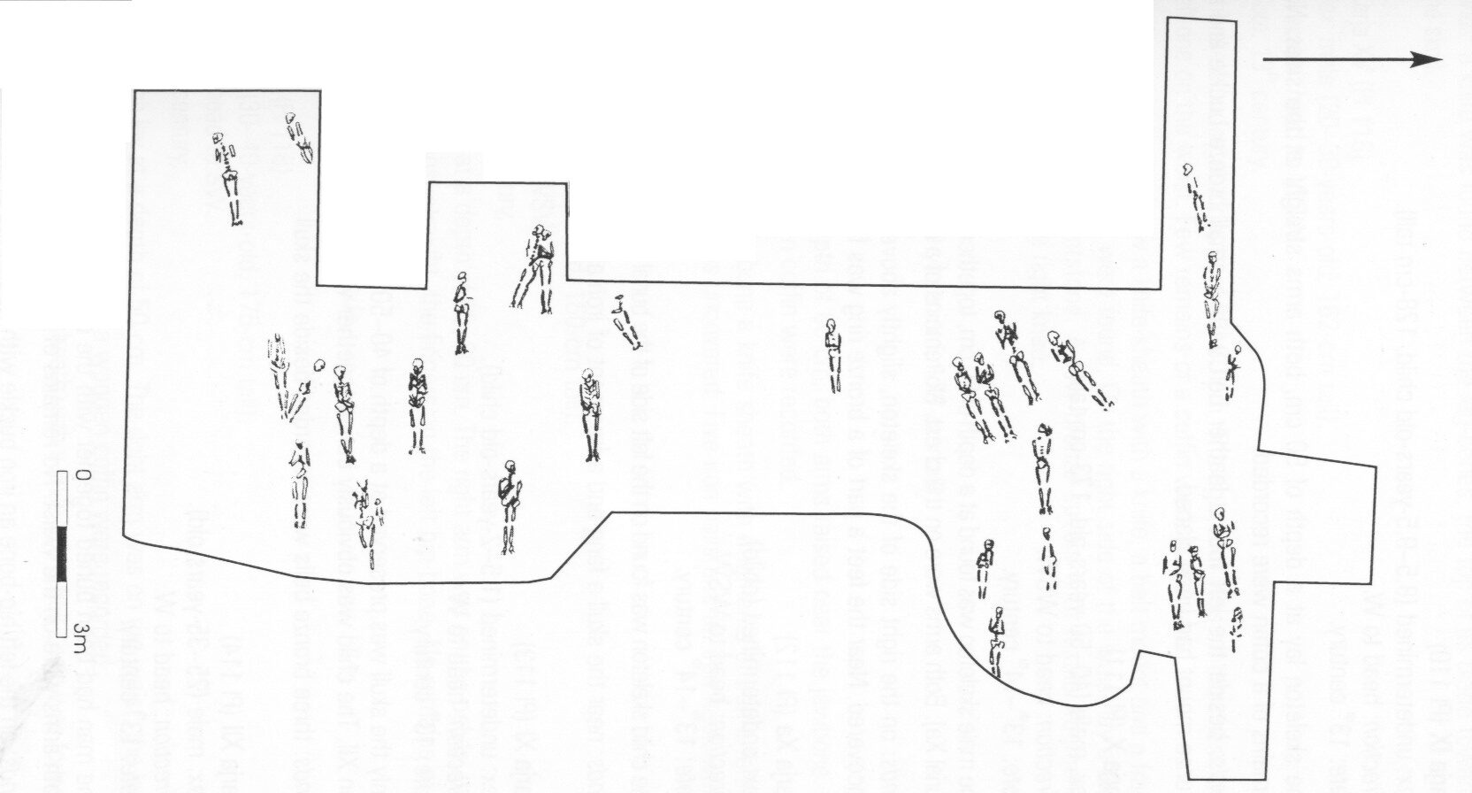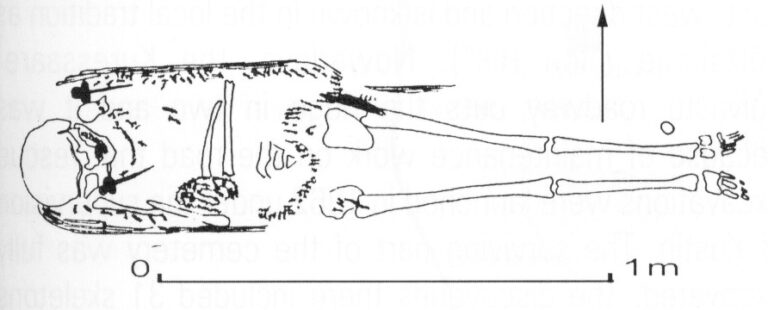 Leiti 34 luustikku, kuid algselt võis siin Kustini hinnangul olla maetud kuni 70 inimest. Kõik surnud olid asetatud haudadesse pea lääne poole, s t kristliku kombe kohaselt, mitmete juures oli säilinud kirstu osi. Kalmistu umbes keskel oli luustikest tühi ala, võimalik kunagine puitkabel. Kaasa pandud esemed ning mitmetest matustest leitud mündid dateerisid kalmistu 13.-14. sajandisse.