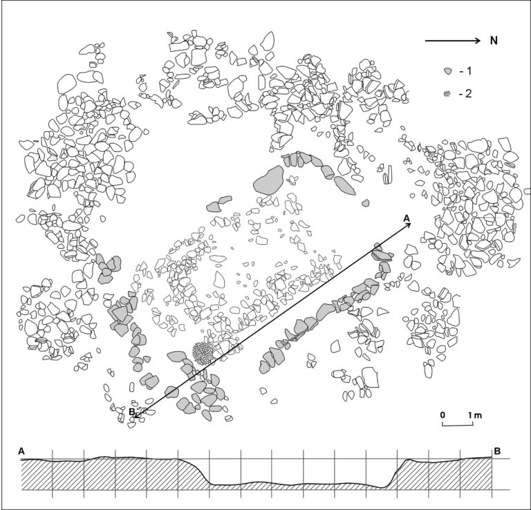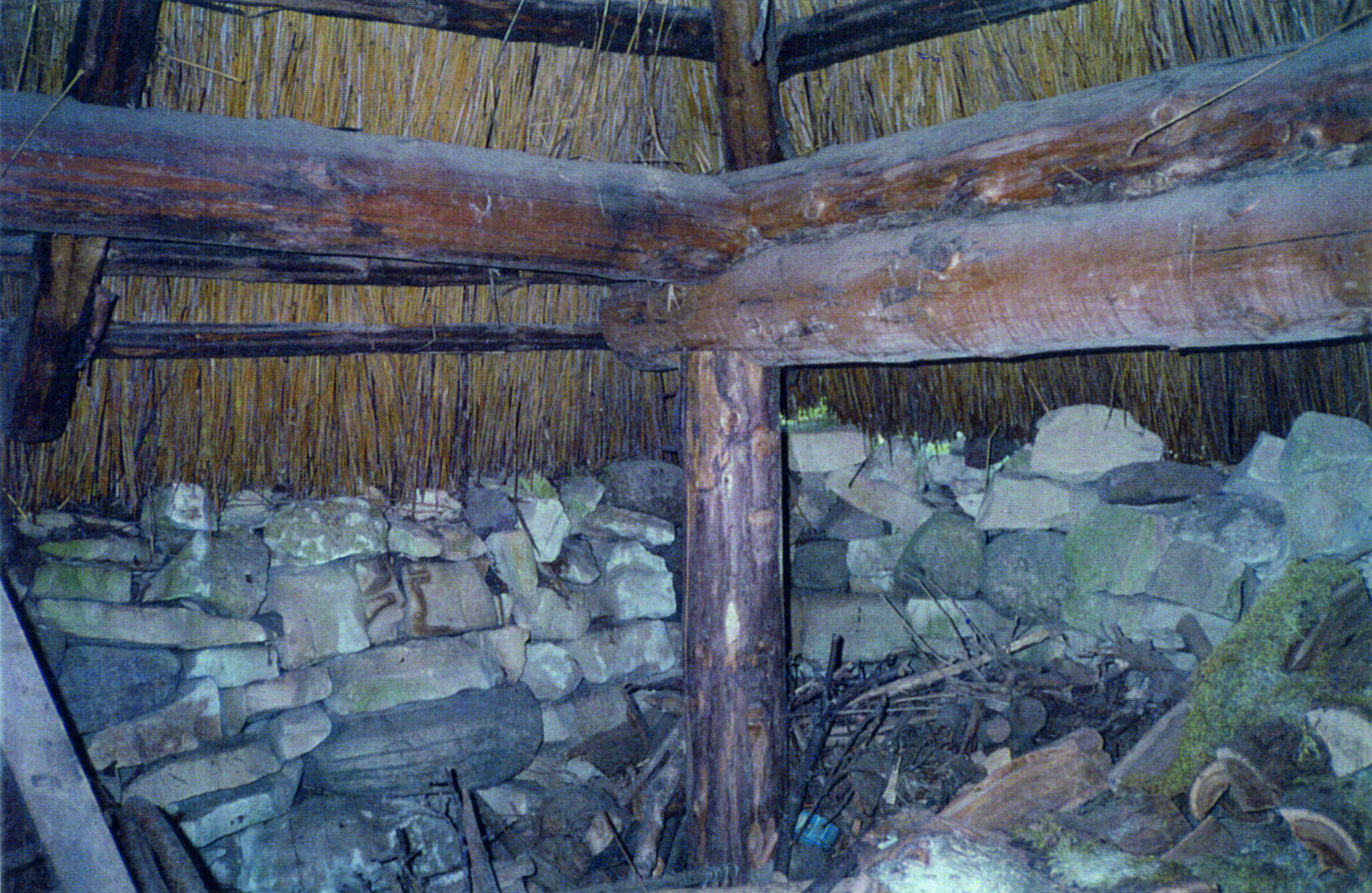 1-1,5 m kaugusel ümbritses hoone maasse süvendatud osa õhukestest paeplaatidest varinguvöönd. Tegu oli kunagise kivikatusega, mis osalt oli varisenud räästa alla, osalt aga kukkunud hoonesse sisse süvendisse ja selle ümbrusesse. Sarnast keskaegset osalt maasse süvendatud hoonet, küll ilma kivikatuseta, on kaevatud näiteks Angerja asulas Põhja-Eestis.