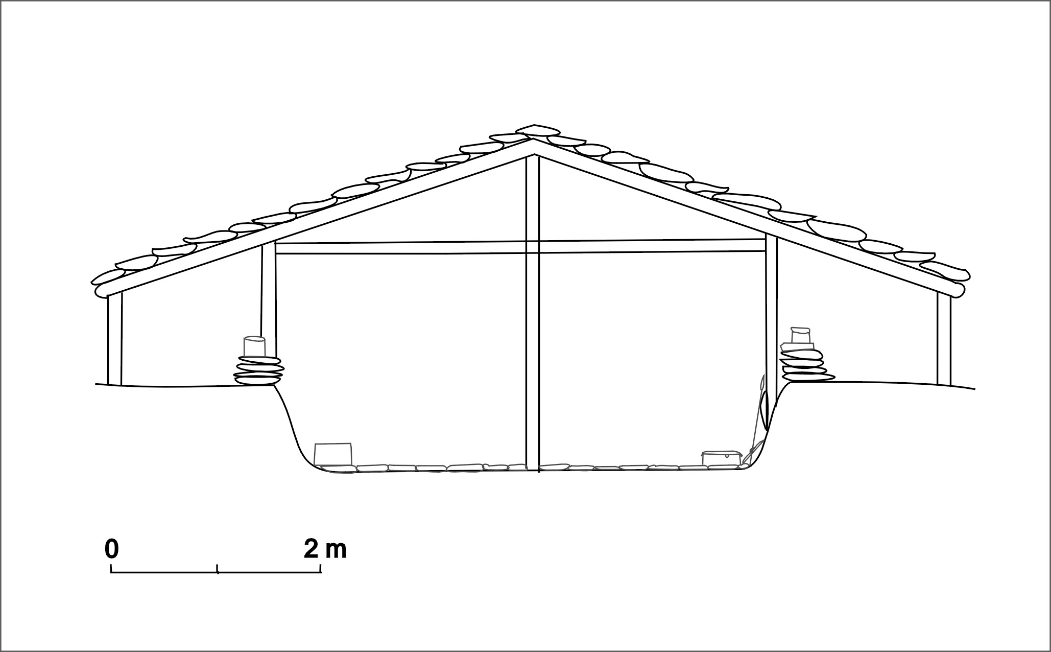 Süvendit ümbritses madal paekividest kuivmüür ning selle mõlemas lühemas otsas oli serv laugjam – siin oli tegu sissepääsudega. Ühes nurgas oli kividega ümbritsetud postikoht, teises nurgas tulease, mille juures süvendi seinad olid mätsitud saviga. Süvendi põhjas oli hästi säilinud paeplaatidest põrand.