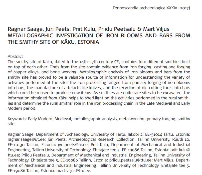 Saage, R.; Peets, J.; Kulu, P.; Peetsalu, P.; Viljus, M. (2017). Metallographic investigation of iron blooms and bars from the smithy site of Käku, Estonia. Fennoscandia Archaeologica, XXXIV, 46−58.