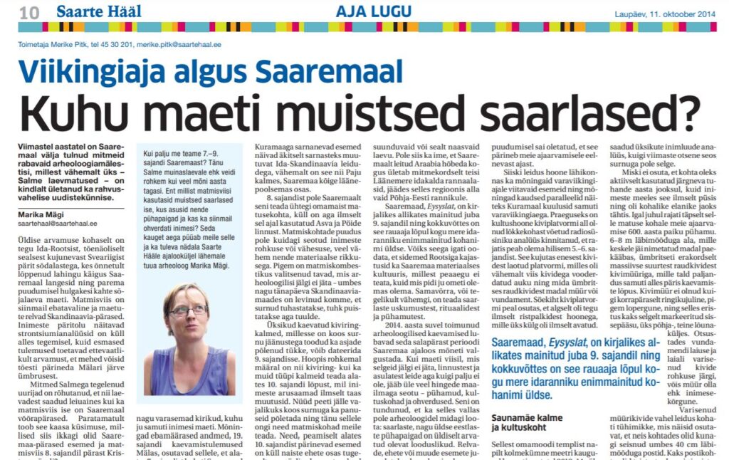 2.  Jätku-artikkel, Marika, M. (2014). Viikingiaja algus Saaremaal. Kas inimesi ohverdati? Saarte Hääl (10−10). (18.10.2014).