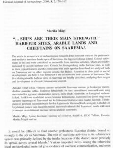 Mägi, M. (2004). “…Ships are their main strength.” Harbour sites, arable lands and chieftains on Saaremaa. Estonian Journal of Archaeology, 8 (2), 128−162.